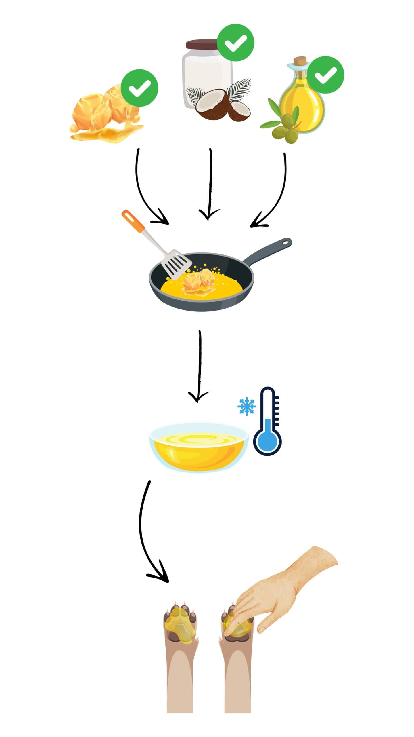 • Sådan gør du: Smelt bivoksen i en lille gryde ved lav varme. Tilsæt kokos- og olivenolie og bland godt. Lad blandingen køle af, inden du hælder den i en lille beholder. Påfør potevoksen på din hunds poter før og efter gåturen for at beskytte mod de kolde og fugtige forhold.